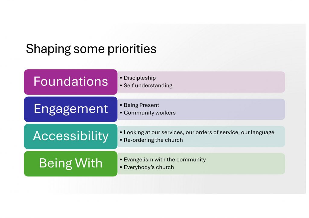 We are excited about the vision for the future and afterwards Lee put together the charts below highlighting the main themes – the next step is to share this with the congregation and then at our next week moving from vision to action planning.